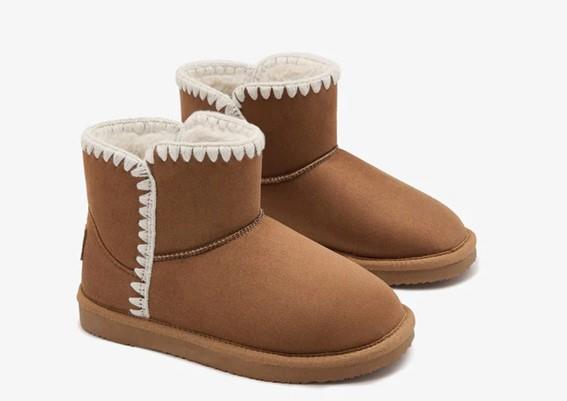 Bota australiana de corte bajo y bordada, en color cuero y forrada de pelo en su interior.