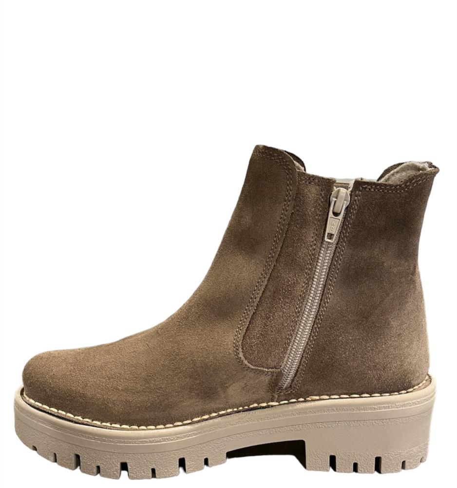 Botín tipo chelsea en piel serraje topo con elástico y cierre de cremallera.