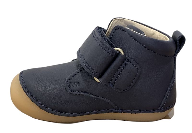 Botita en piel azul marino con cierre de velcro. Perfecta para los primeros pasos, suela de goma blandita y con punterita de goma.