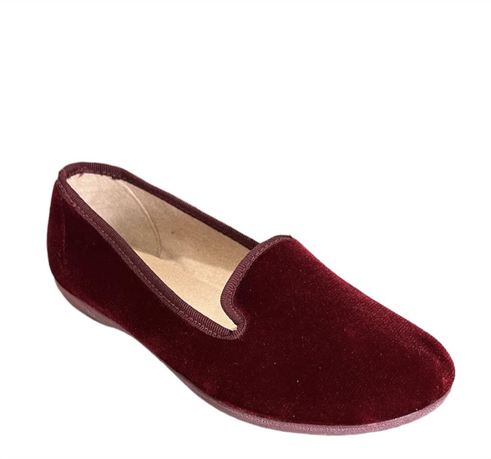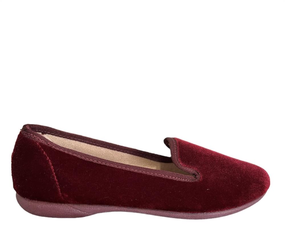 Zapatilla tipo slipper en terciopelo burdeos.